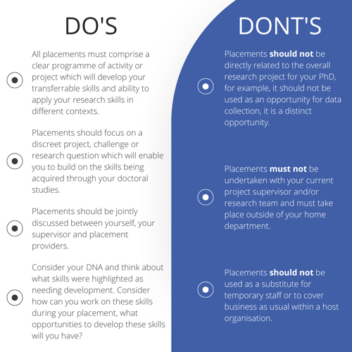 Placements are designed to be separate from your main research project. They should not be used for data collection or be hosted by one of your project supervisors. Instead, they offer a valuable chance to develop professional skills in a real-world context. Placements should focus on a discrete project, challenge or research question which will enable you to build on the skills being acquired through your doctoral studies.
